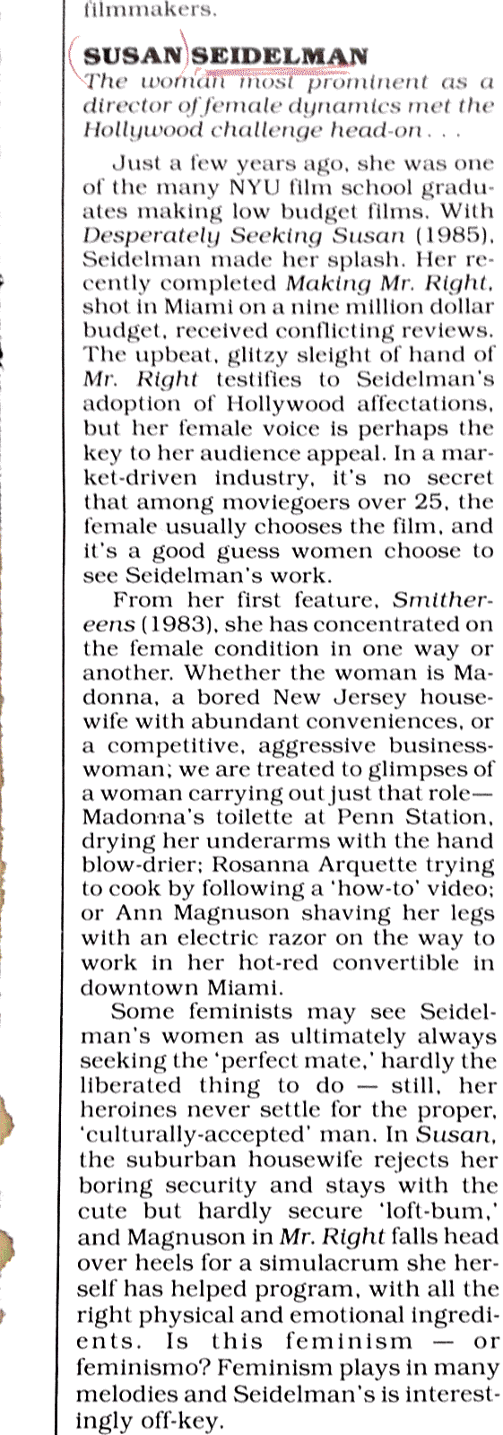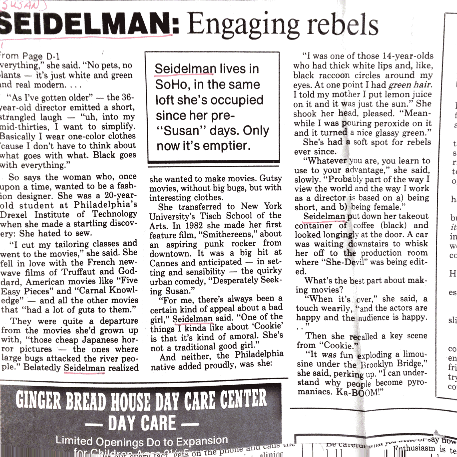 Susan Seidelman was interviewed on June 26, 2018 and July 19, 2019. You can buy Smithereens on Blu-ray from the Criterion Collection here, or stream it on The Criterion Channel and HBO Max; the former is also streaming two of her earlier short films.